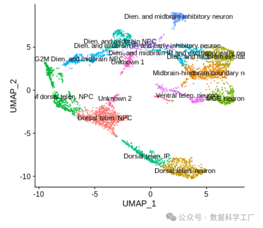 有趣的是,聚类 10、5、0、6 和 2 中的细胞在 UMAP 图上形成了一个类似轨迹的结构,这可能反映了从神经祖细胞到神经元成熟的分化过程。稍后会进一步探讨这个问题。