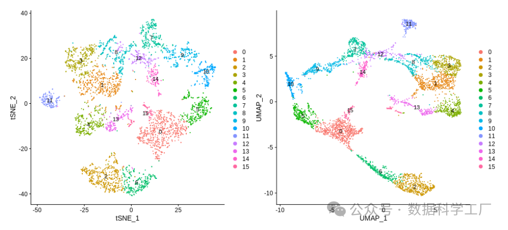 然后,可以利用之前生成的 tSNE 和 UMAP 嵌入来可视化聚类结果。
