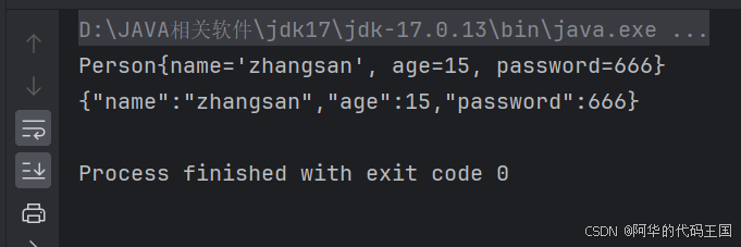 String jsonStr = "{\"name\":\"zhangsan\",\"age\":15,\"password\":666}";