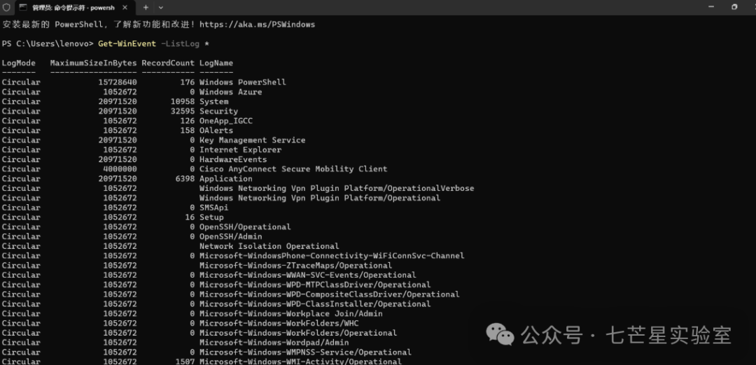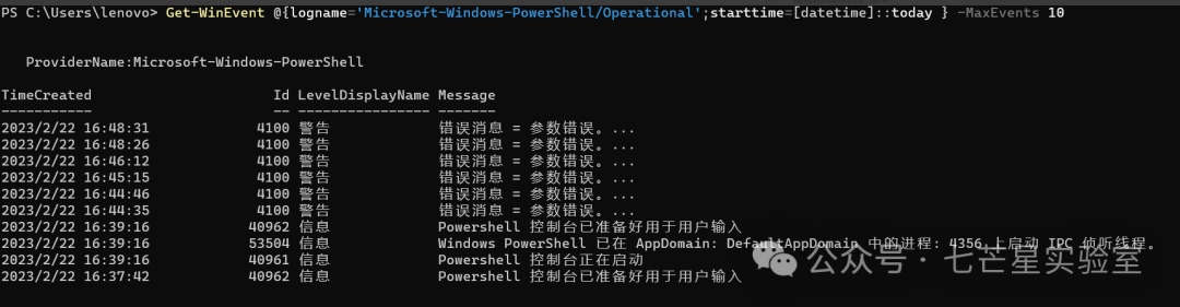 powershell今天操作日志的最近10条,注意这里的logname必须是loglist中得到的: