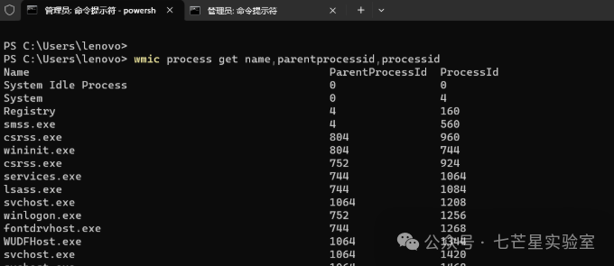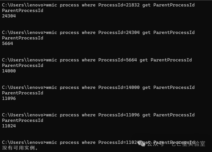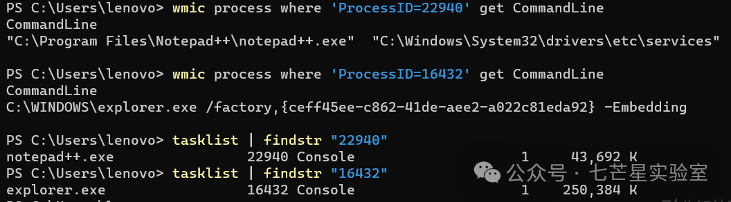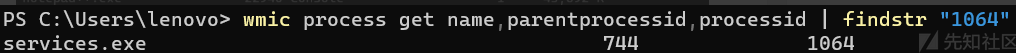 详细的进程的名字,跟直接tasklist差不多:wmic process where ‘ProcessID=PID’ get CommandLine,这个services是最终的父进程,在这里notepad++的上一级父进程是explorer,再上一级是svchost,再上一级是services