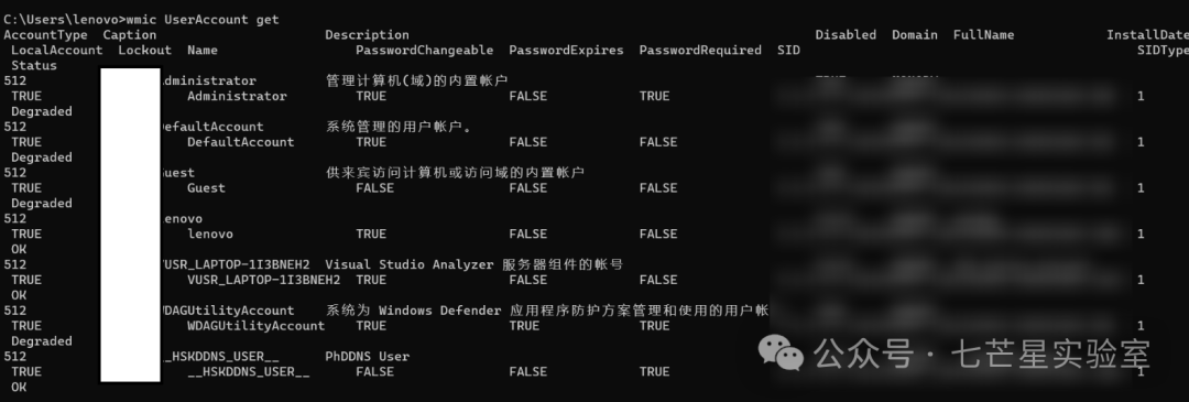 wmic UserAccount get,列出系统所有账户详细信息