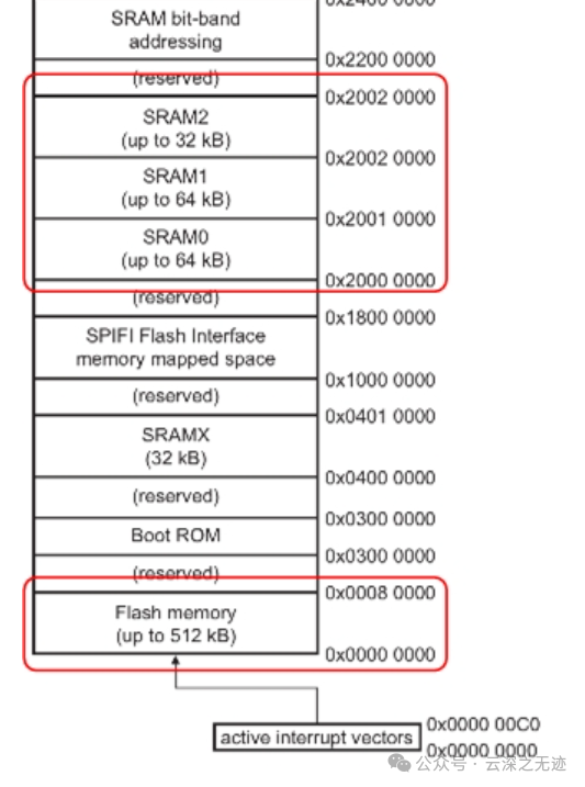 如下图是一个MCU的Memory MAP,参看分散加载里面的地址,Flash以及SRAM的起始地址以及大小都落在有效的空间上了。