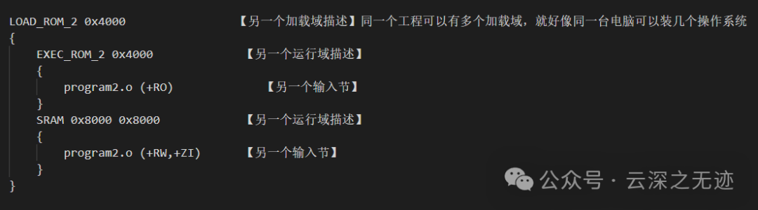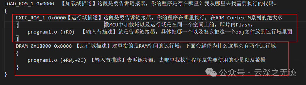 <3>所以分散加载可以简单理解为的最基本结构就是至少3个域(这个事实上不对,但是对于大多数Cortex-M系列MCU的分散加载可以这样简单理解):至少一个加载域、建议两个运行域(一个RO运行域、一个RW+ZI运行域),就是你要告诉链接器至少3个信息: