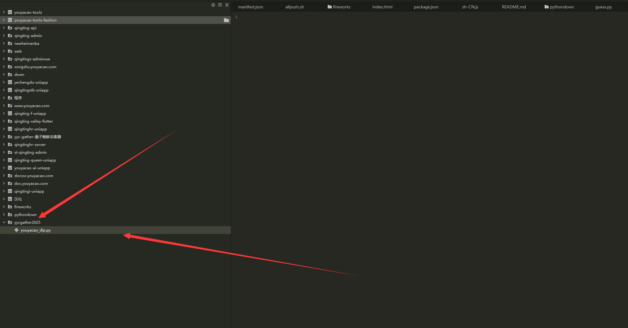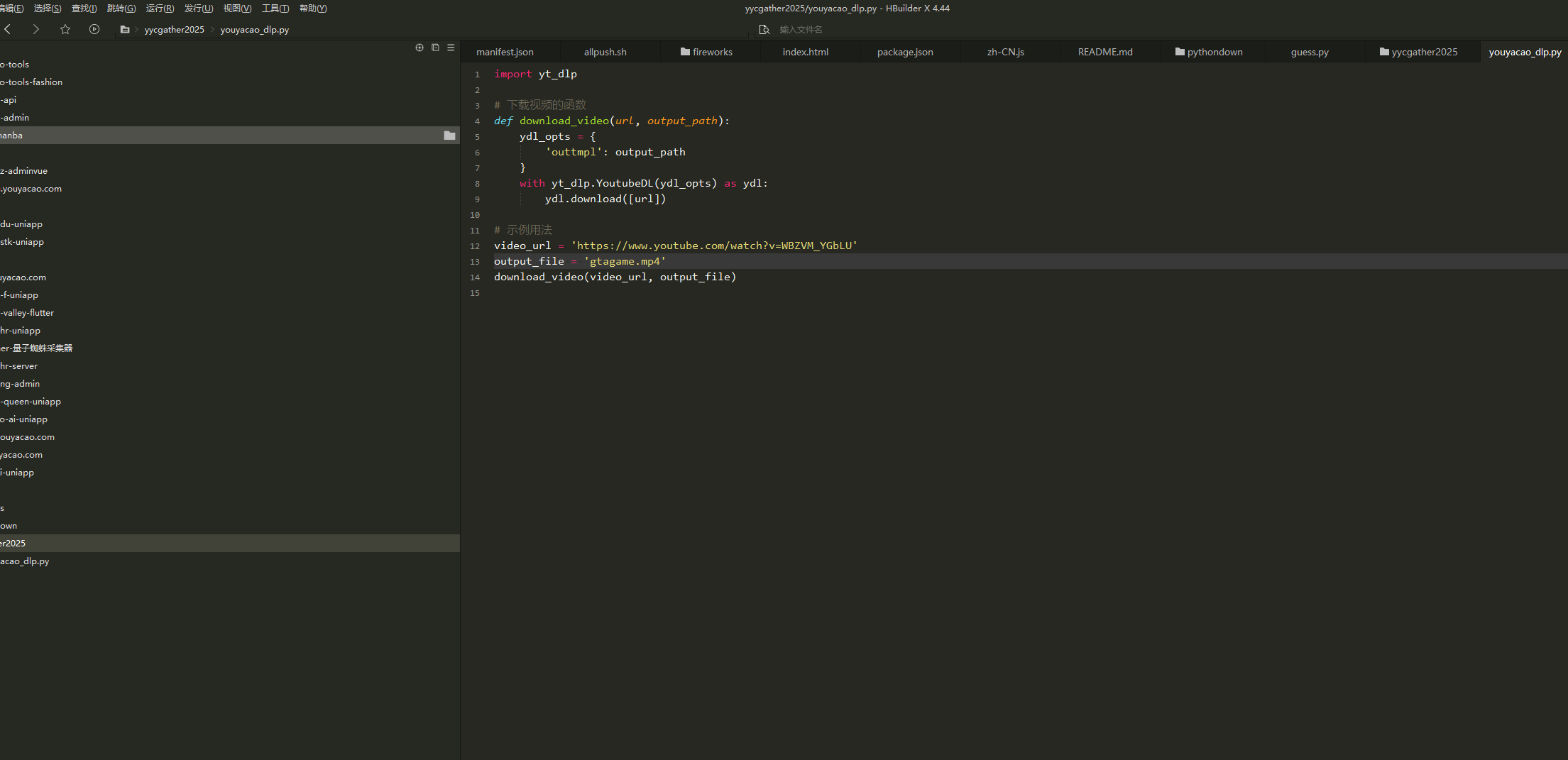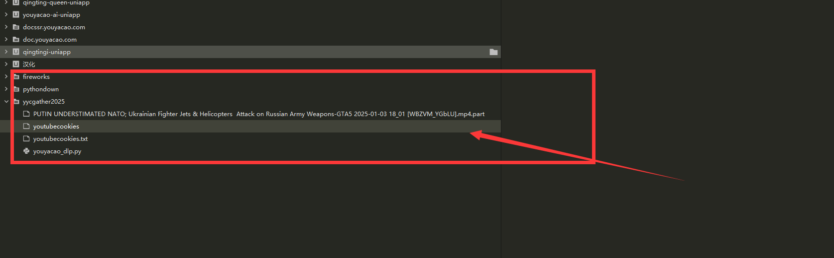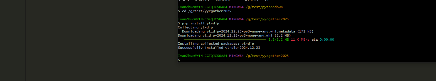 配置好以后,我们开始第一种方式使用yt_dlp首先我们安装,执行前先创建好目录yycgather2025和对应文件,我这里取名youyacao_dlp.py