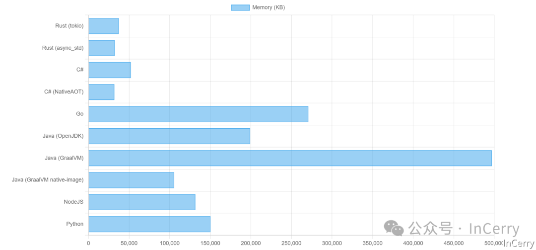 Java 使用 GraalVM 的结果有点出人意料,因为它比 OpenJDK 的 Java 消耗更多内存,但我猜这可以通过一些设置来调优。