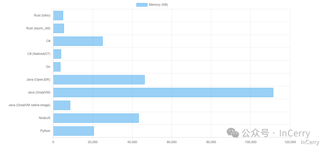 Rust 和 C# 在这种情况下都表现得很好。一个大惊喜是 C#(NativeAOT) 甚至比 Rust 消耗更少的 RAM ,击败了所有其他语言。非常令人印象深刻!