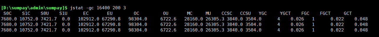 jstat [option vmid [interval [s|ms] [count] ] ]其中 interval 是查询的间隔时间,count 是查询的次数。我们来看一下 jstat -gc 16400 200 3 这个例子,代表每 200 毫秒执行一次 jstat -gc 命令,连续执行 3 次。