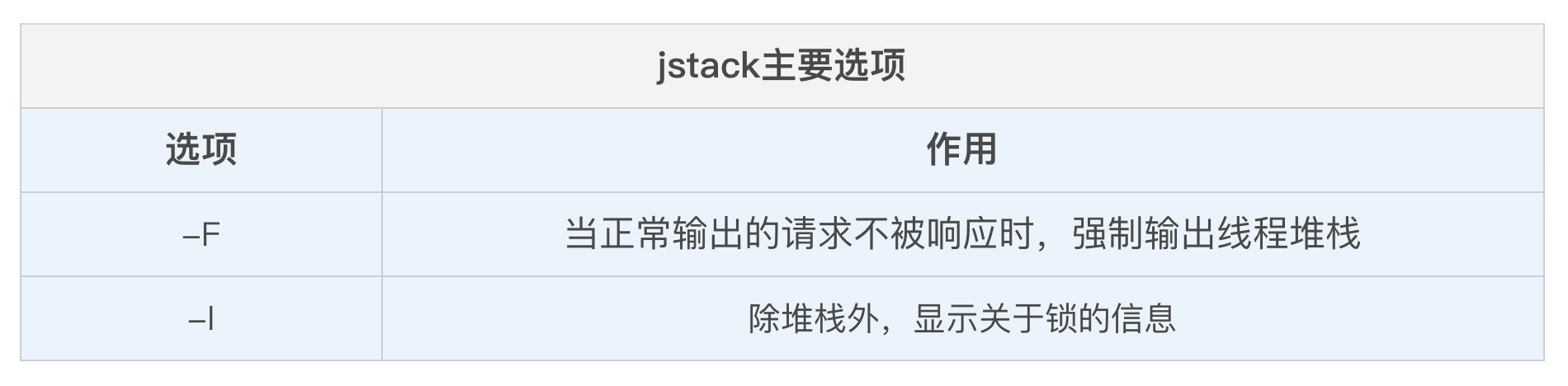 下面的列表是 jstack 具体选项的作用,你可以自己在服务上敲一下命令试试。