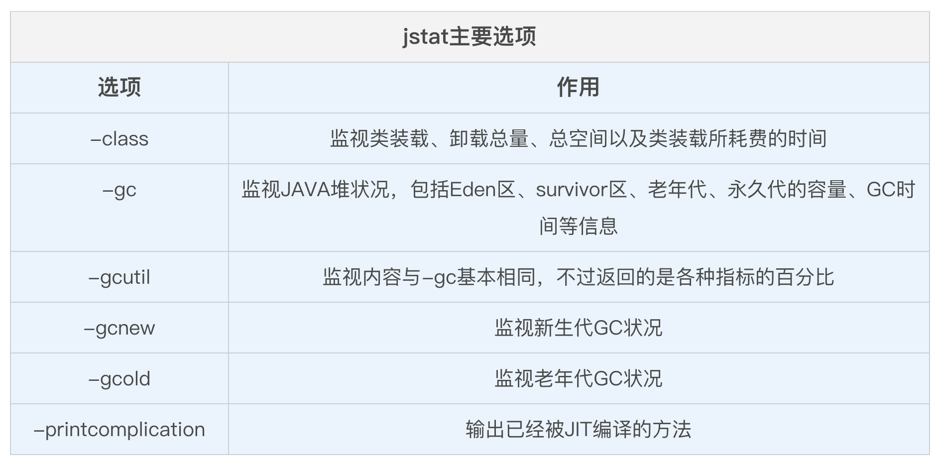 下面的列表是 jstat 一些选项的作用,你可以自己在服务上敲一下命令试试。