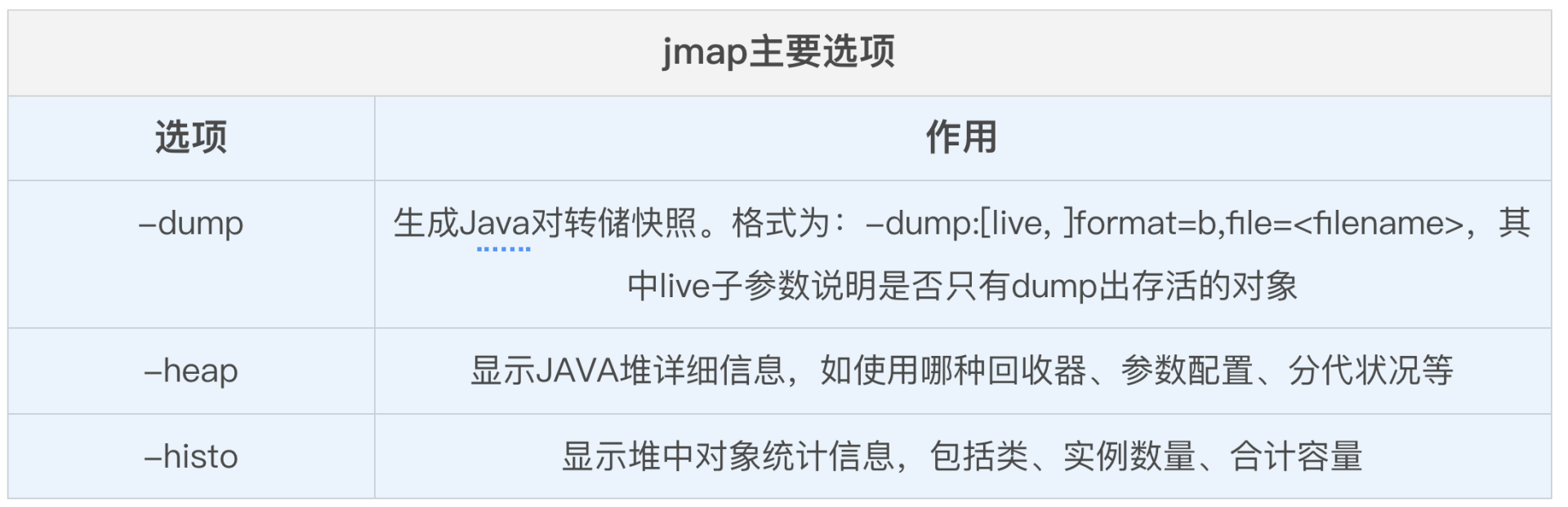 jmap [option] vmid再来了解一下具体的 option 选项的作用: