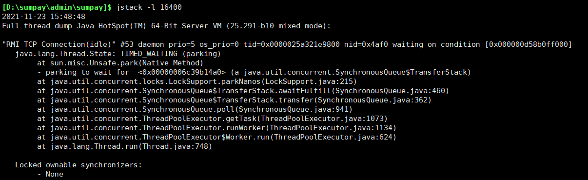 jstack [option] vmid我们使用 jstack -l 16400 查看线程堆栈。