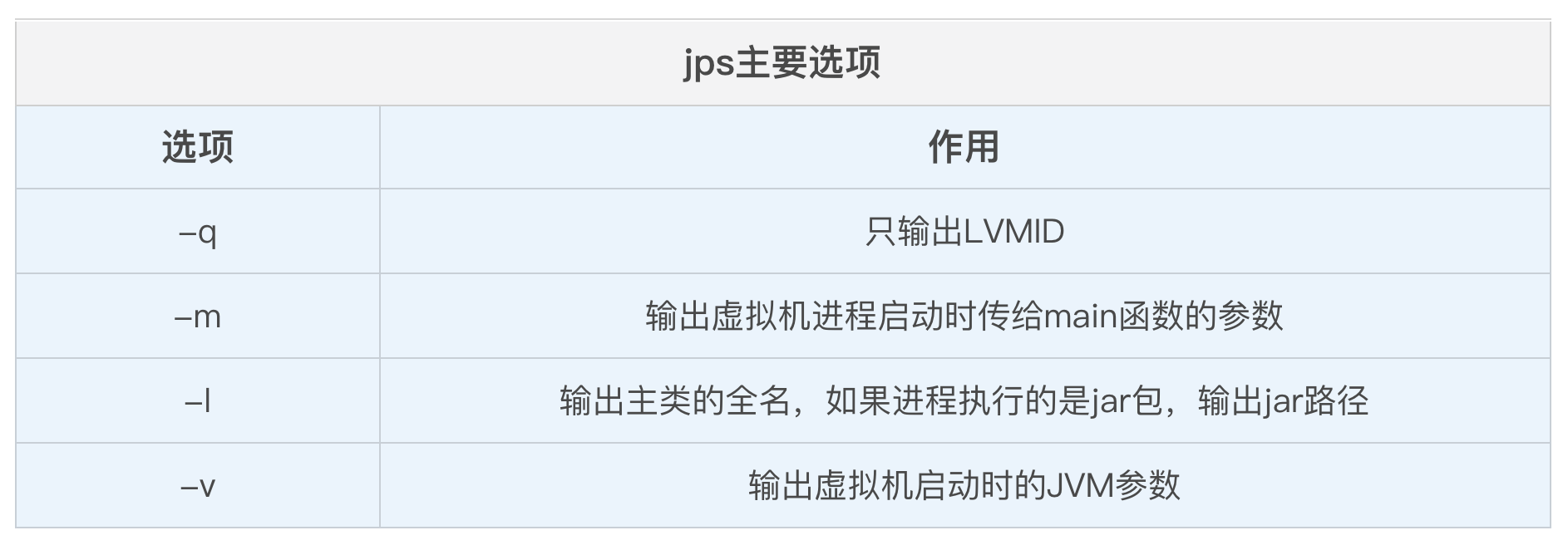 下面的列表是 jps 一些选项的作用,你可以自己在服务上敲一下命令试试。