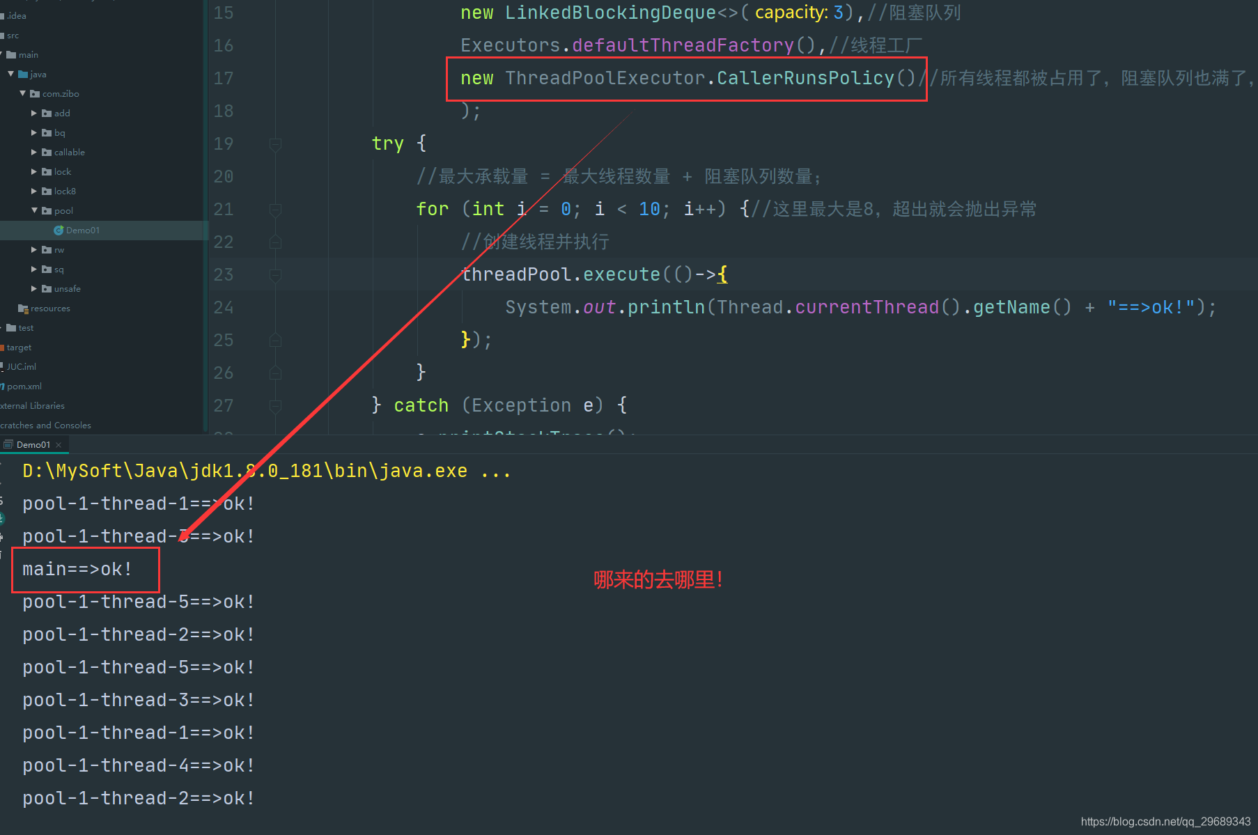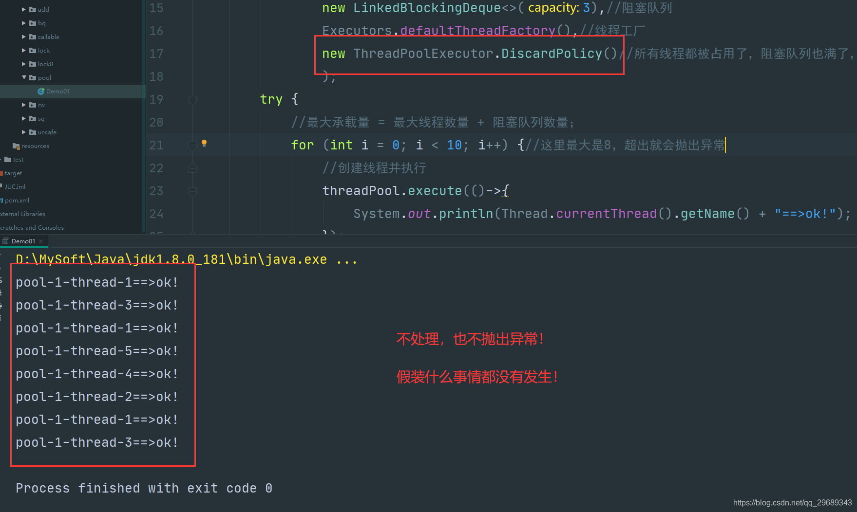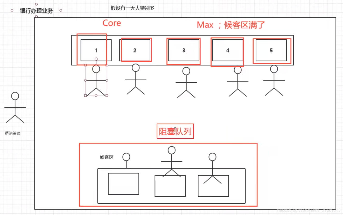 new ThreadPoolExecutor.AbortPolicy():所有线程都被占用了,阻塞队列也满了,还有线程进来,就不再处理,并抛出异常;