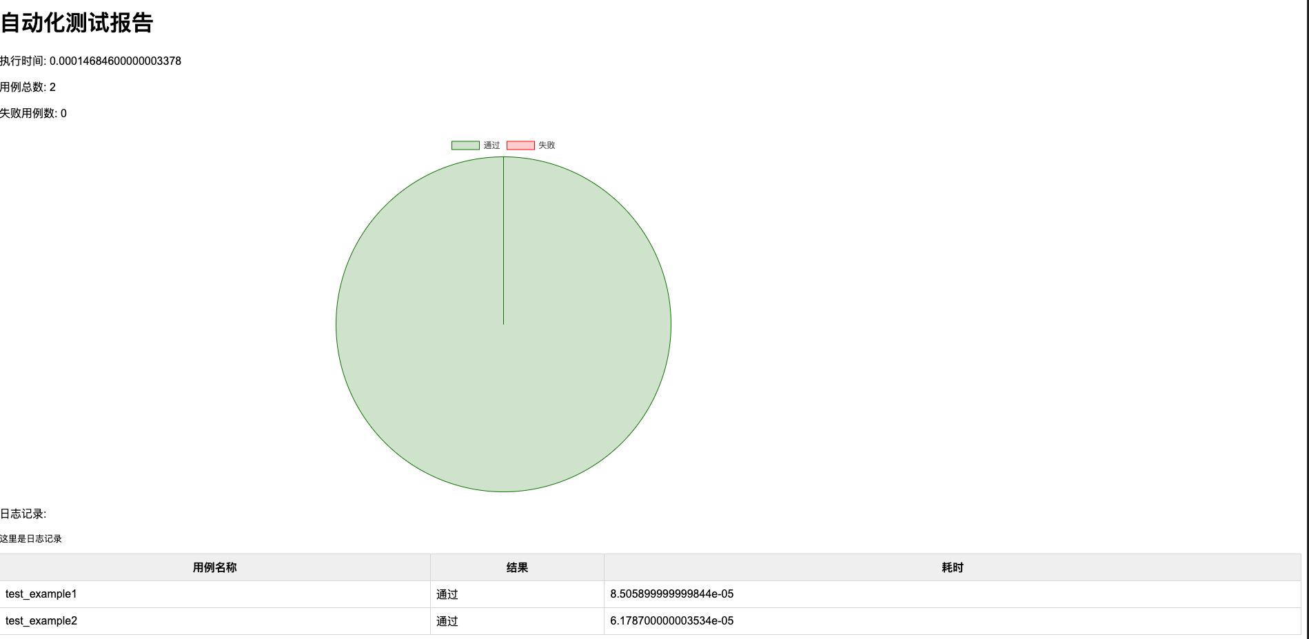 运行完成后,你将在当前目录下找到一个名为 test_report.html 的文件,它包含了根据 Jinja2 模板渲染的测试报告。报告中包括了测试结果的汇总信息、执行时间、用例条数、日志记录以及一个展示通过和失败用例比例的饼图。