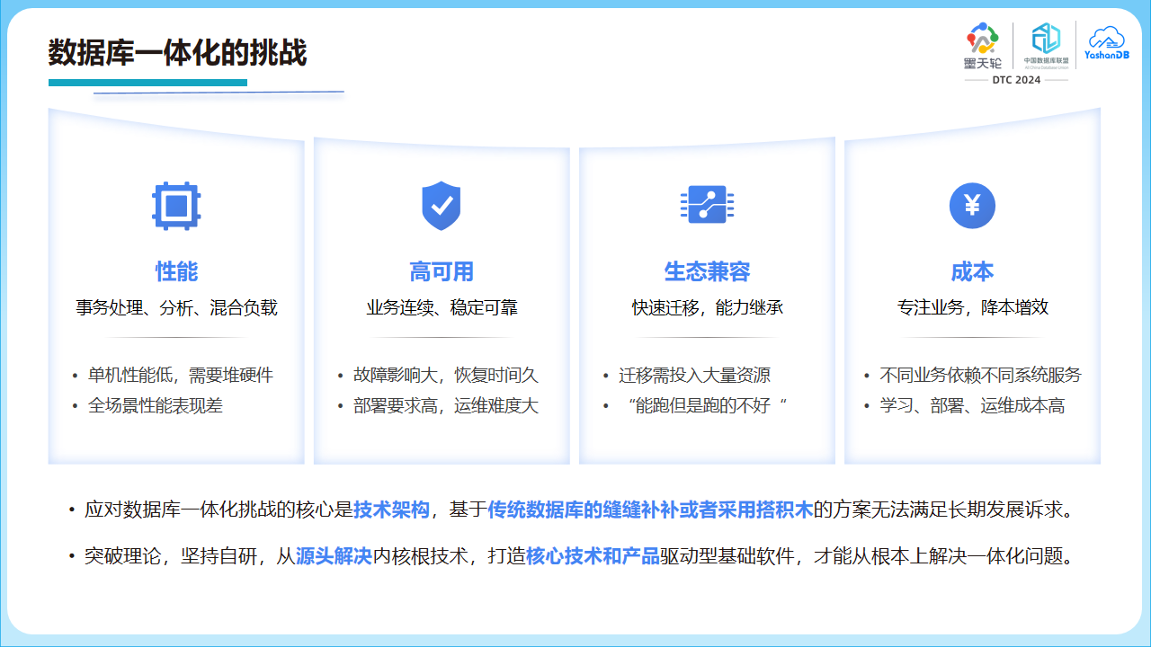 面对这些诉求,传统解决方案难以满足业务的创新发展,数据库一体化解决方案迫在眉睫,但目前面临比较大的挑战,可以概括为以下几个方面: