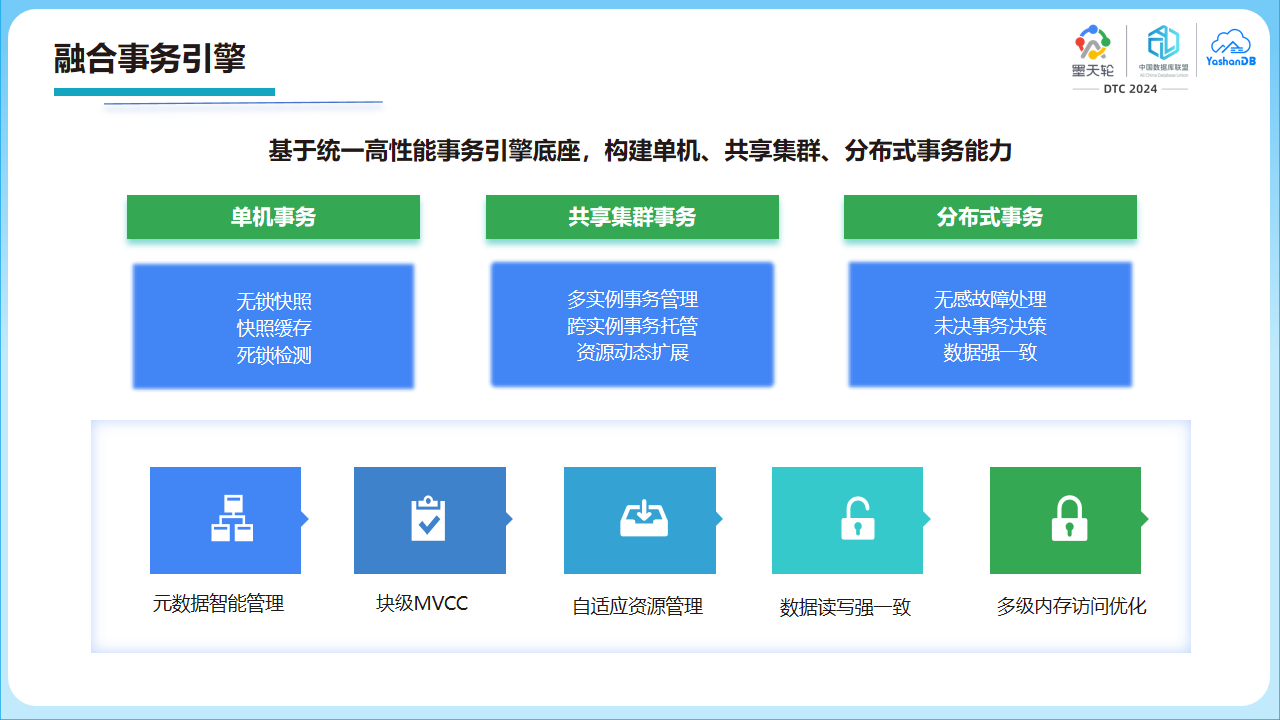 融合事务引擎通过智能元数据管理、高性能块级MVCC机制、自适应资源管理、多级内存访问等技术实现了事务存储和处理底座,既支持不同事务隔离级别,又能提供高性能的并发事务能力,同时也可以保证强一致。