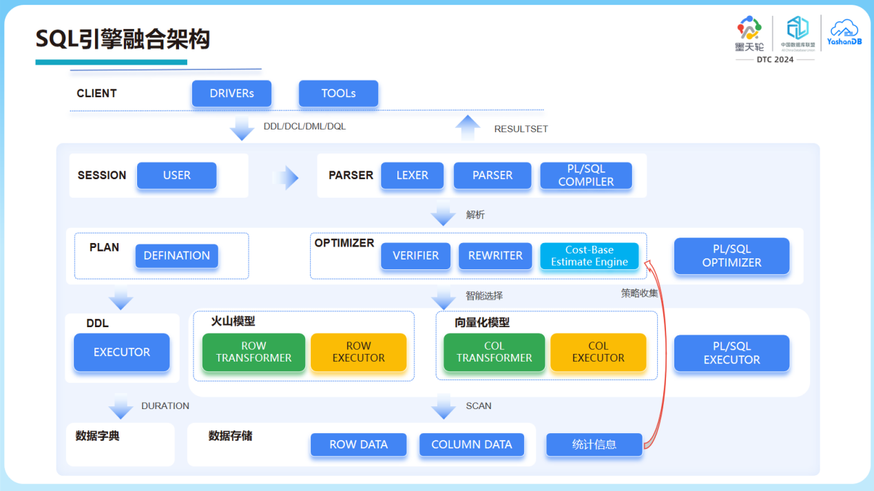 优化器通过智能优化技术自动根据计算要求确定采用最优的计算模式,并生成相应的执行计划。YashanDB优化器的融合体现在基于统一的自适应COST模型、静态/动态重写能力,构建了原生HTAP优化框架,支持单机和分布式计划的生成,智能选择行列混合执行计划,并融入向量化执行、分布排序属性,支持B-Tree索引、稀疏索引、R-Tree索引、AC物化视图等各类型加速结构,确保无论针对TP的短小交易,还是针对AP的大数据批量操作,都可以选择出最佳的执行方式;