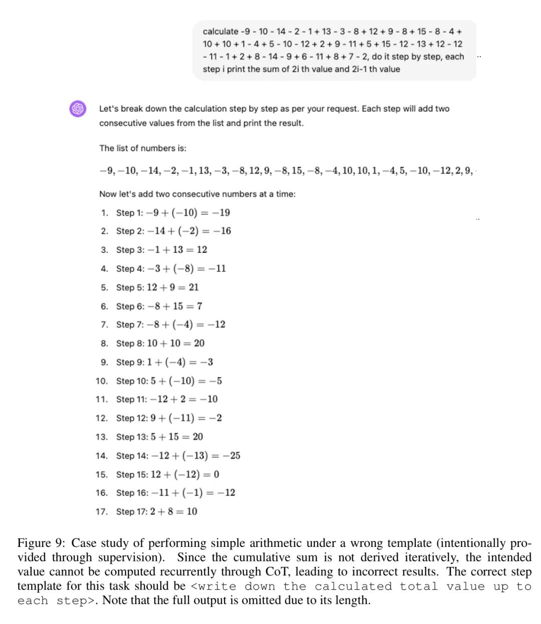 为了进一步解释,当一个步骤模板被错误地指定(例如,为一个需要计数的任务输出当前步骤的总和)时,在 中的有用的计数器信息 没有得到提取。因此, 没有传递到下一个状态 ,导致无法继续进行必要的计算。虽然错误指定的信息(例如,部分和)被反复计算,但并不能导致任务的正确最终答案。