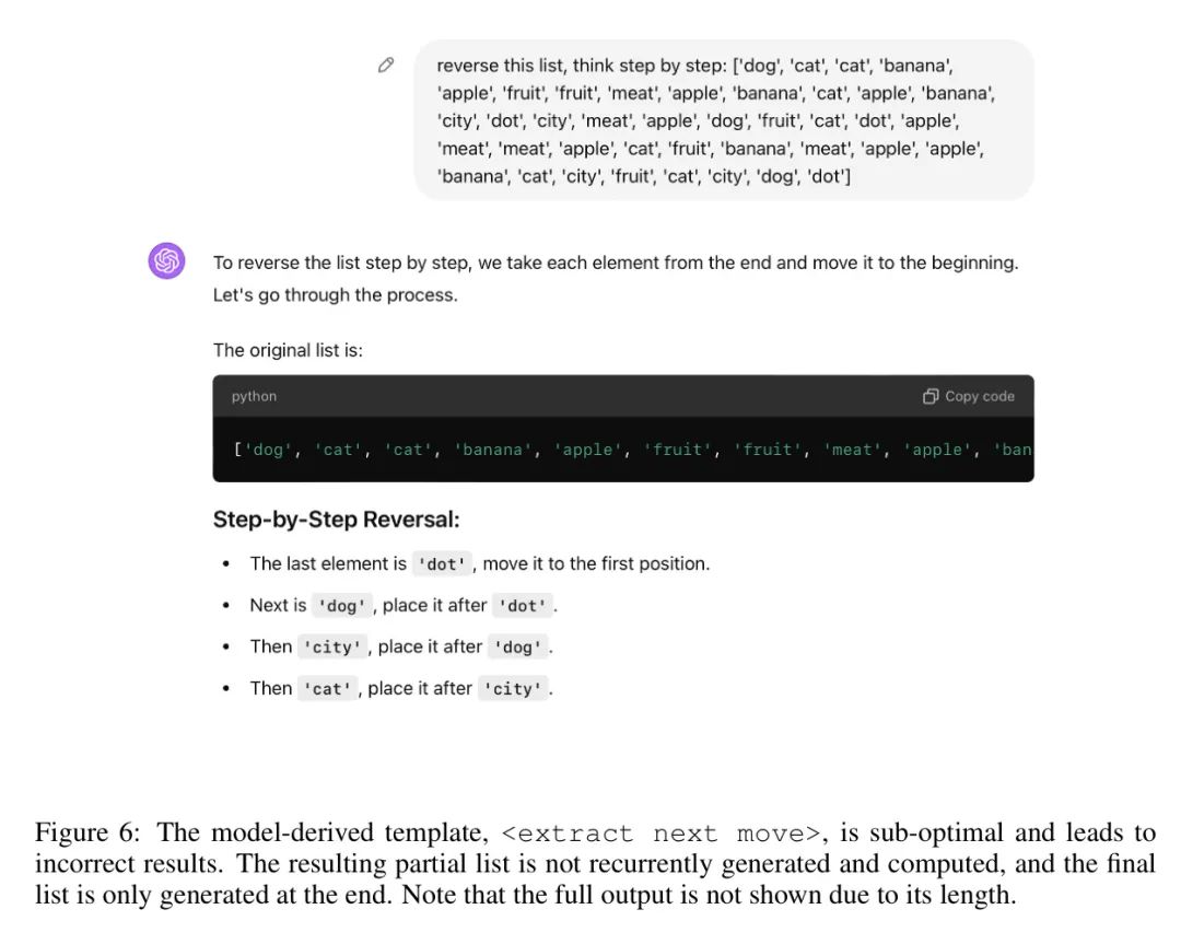 例如,在象棋模拟的情况下, 编码了诸如 <当前棋盘布局>、<下一个玩家>、<棋盘状态>、<每个玩家夺取的棋子数> 等等详细信息。当给出“逐步思考”的指令时,模型根据它生成的_步模板_来决定提取哪些信息。提取错误的信息可能会在后续步骤中阻碍推理,因为_递归_无法有效地在所需信息上进行。