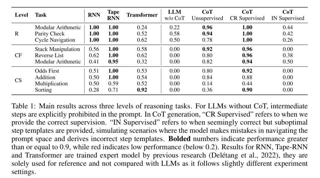 重复性是推理的关键。 正如专家模型(RNN、Tape-RNN 和 Transformers)和 LLM 所证明的那样,重复性是解决每个类别任务的决定性因素。具体来说,像 RNN 和 Tape-RNN 这样的专家模型,根据其记忆架构,在解决各种类别任务时,都能达到 90% 以上的准确率。然而,Transformers 的推理深度较浅,如前所示,因此无法解决任何任务。同样,没有 CoT 的 LLM 仅依靠内部 Transformers 推理,在大多数任务上实现了 0% 的性能,其他任务上的低性能可能是由于猜测造成的。当 CoT 增强 LLM 的重复计算能力时,准确率显著提高。这些比较突出了在模型可计算性中重复性的关键作用,进一步证实了作者在之前讨论的分析。