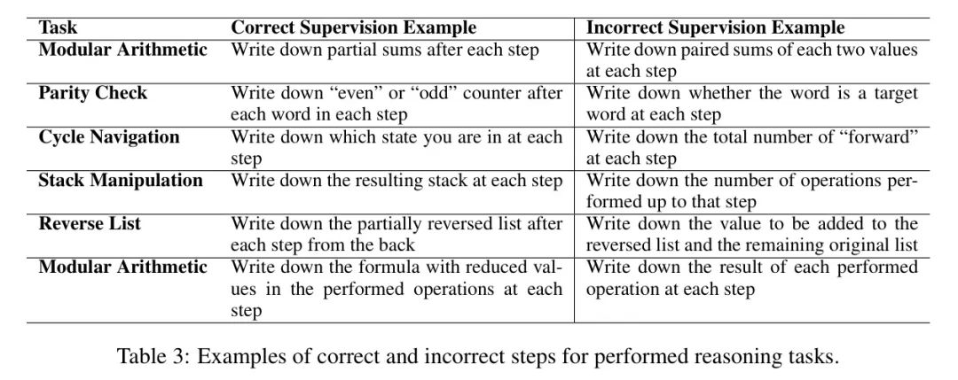 角色:步模板在推理性能中的作用:监督至关重要。 作者为所有任务提供人工监督,并观察到,由于任务的相对简单性,模型在找到最优步模板时较少出错。因此,很难明确观察到最优和非最优步模板之间的性能差距。为解决这个问题,作者对每个任务引入了两种类型的监督:正确监督(CR监督),其中模型受到最优步的指导以展示最佳可能的性能,和不正确监督(IN监督),它模拟了模型得出不正确步的场景,以展示性能可能会降低。作者在表3中为每个任务提供了这些受监督场景的示例。