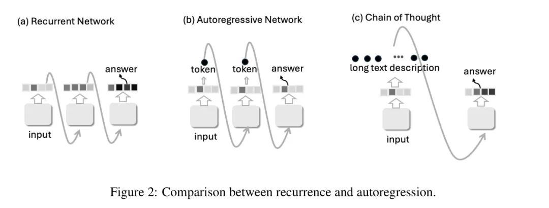 以前的研究表明李等(2024);张等(2024);冯等(2024),思维链(CoT)有效地在大语言模型(LLMs)中弥合了自回归李等(2022);刘等(2022)模型与循环结构张等(2024)之间的鸿沟。CoT不仅将自然语言作为强大的信息编码媒介,而且生成中间步骤(不是答案的一部分),这些中间步骤表示为自然语言 Token 序列(o1, o2, ..., o_k),作为潜在信息向量h_n(图2.c)的离散化。由于自然语言是几乎可以编码任何类型信息的一种强大媒介,h被有效地转换为 Token 序列o,然后通过嵌入层转换回向量h。这样,通过离散化然后向量化,实现了h_t→h_(t+1)的效果,如图2.c所示。这种方法,实际上实现了与RNN类似循环网络中h_t→h_(t+1)相同的效果,使得h可以由网络循环更新。