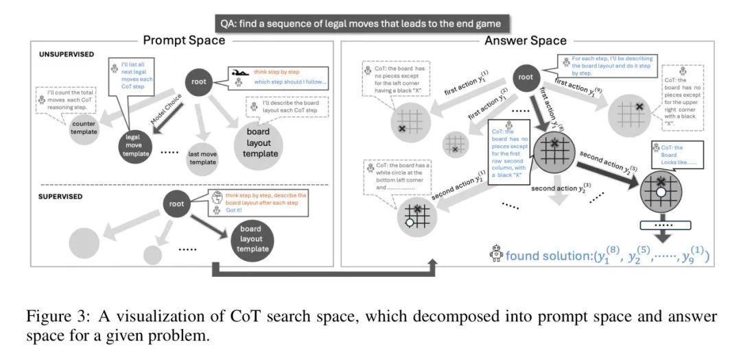尽管理论表明,结合CoT的LLM可以解决任何问题(Li等人,2024年),但在实践中找到解决方案要困难得多。CoT受到有限步骤的限制,从潜在状态到 Token 序列的转换是不完美的。因此,在每一步只能提取部分信息,这使得继续正确计算变得至关重要。作者将CoT推理分解为两个组成部分:在 Prompt 空间内进行模板搜索,以及在答案空间内进行答案搜索。作者展示了如何有效地在 Prompt 空间中导航可以简化答案空间复杂性,并揭示无监督的"X-of-thought"方法的局限性。