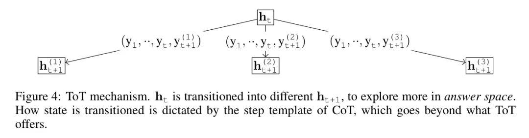 在实际应用中,答案空间可能很大且复杂,即使使用最优的步骤( Prompt )模板,CoT也可能出错。为了解决搜索过程中的这些错误,已经提出了多种CoT变体,如思维树(ToT)和思维图(GoT)。这些“思维X”方法并不规定在每个步骤中提取特定信息,而是通过探索多条路径和自我验证来改进解决方案的寻找。例如,ToT在某个给定的模板下,同时探索答案空间中的多个实例,与CoT的单路径探索不同。具体来说,使用从当前隐藏状态提取的信息用于生成下一步骤的可能答案。每个答案都会导致下一个不同的隐藏状态。在寻找导致游戏结束的一组行动的例子中,步骤的棋盘状态使用正确的模板进行描述,形成,而不是从生成单一的下一步行动,而是推导出多个行动。每个推导出的行动与之前的行动形成一个唯一的路径,该路径通向中的一个潜在解。由于某些路径可能失败(例如,导致非结束游戏),同时探索多条路径可以提高搜索答案空间的效率。可视化结果如图4所示。