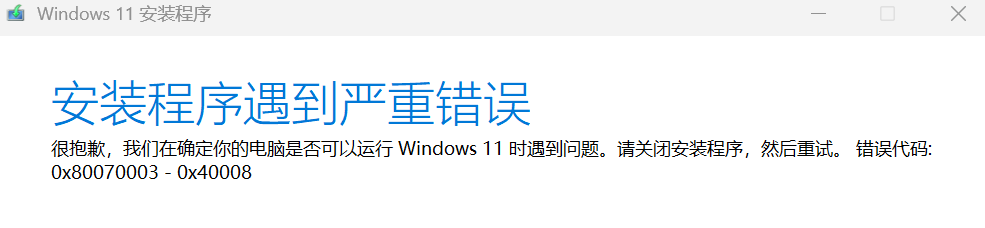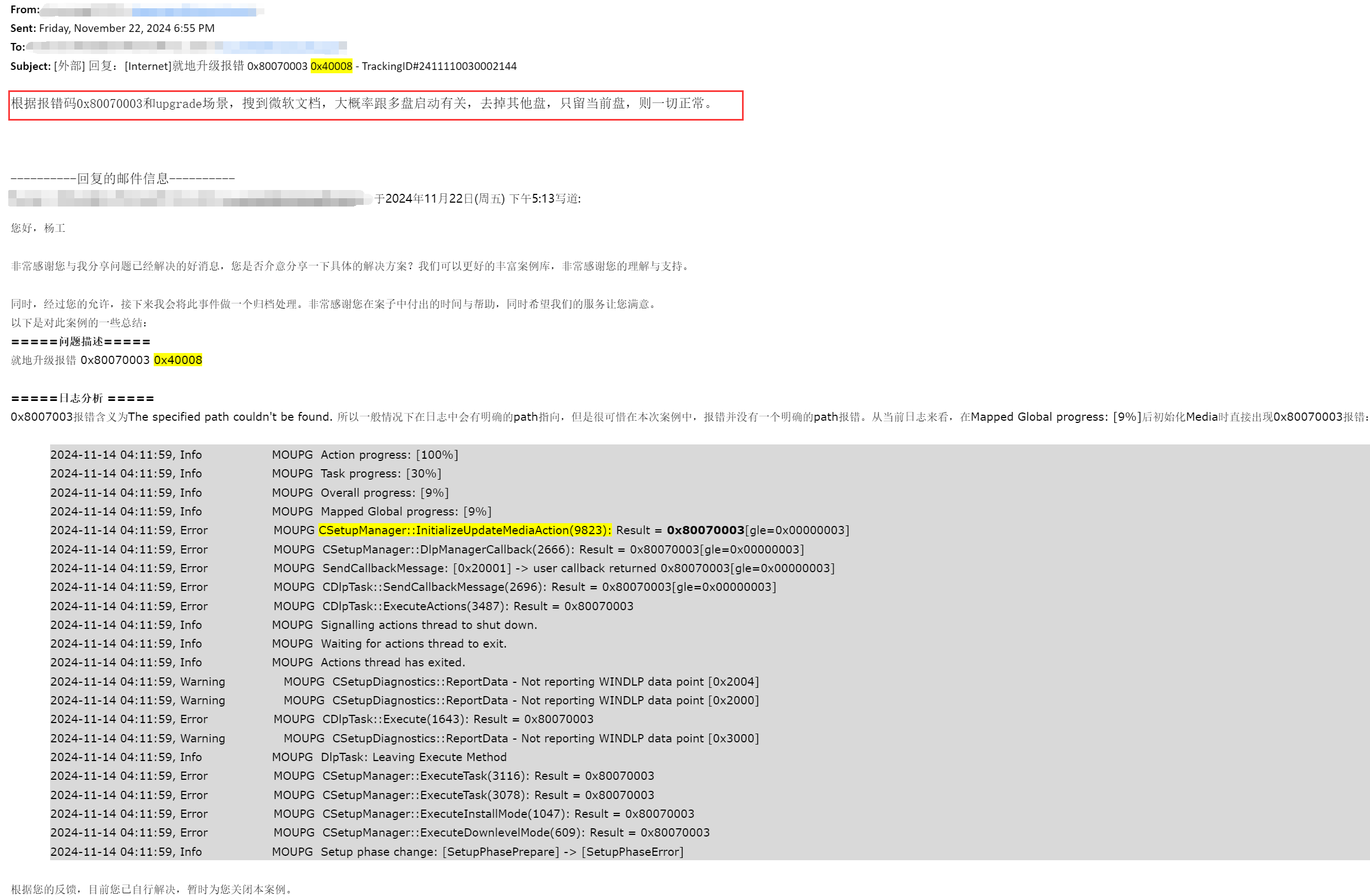 Win11 Unable to upgrade,就地升级报错:0x80070003 0x40008,找微软支持,无果,最终自己解决后告诉的微软