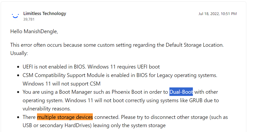 受该文档中Dual-Boot、multiple storage devices这2个关键词的启发,想到自己是多盘系统,去掉其他盘,只留目标盘,就地升级没有问题。
