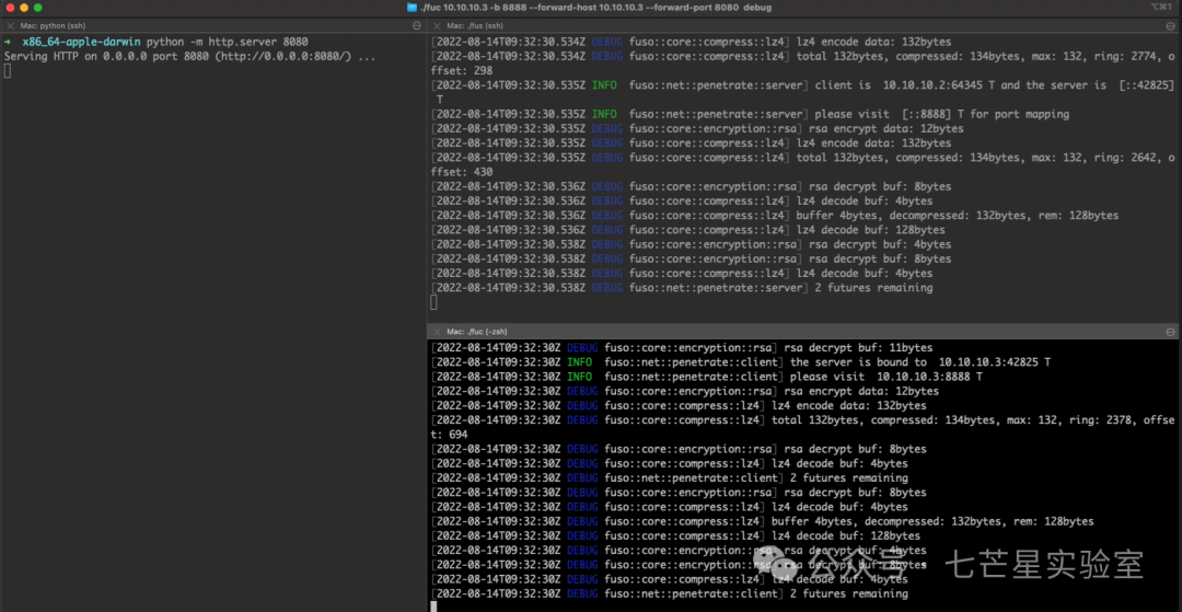 > fuc --bridge-listen 0.0.0.0 --bridge-port 9991 10.10.10.2 9999 # 第二级, IP: 10.10.10.3