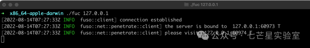 Step 3:在你需要穿透的电脑上启动fuc 如下图,则表示客户端启动成功(备注:默认情况下,将转发到127.0.0.1:80, 访问端口将随机分配)