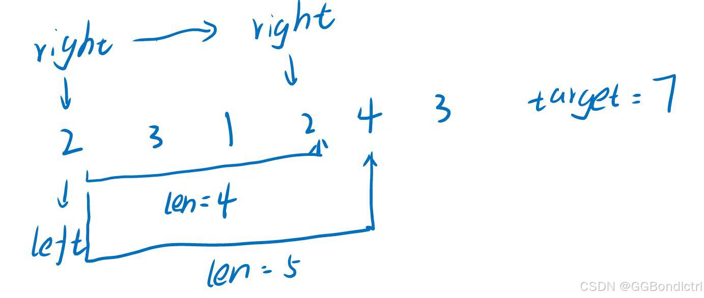 在暴力枚举的操作的情况下,我们发现当子数组内的元素之和已经大于了目标值了,那么此时right就不用向后面走了(因为后面再加肯定大于目标值,但是长度一直在增加,但是这里要最小的),然后left就可以向前走了,若此时数据变小right继续往后面走,此时就会发现,right和left两个指针一直前进;