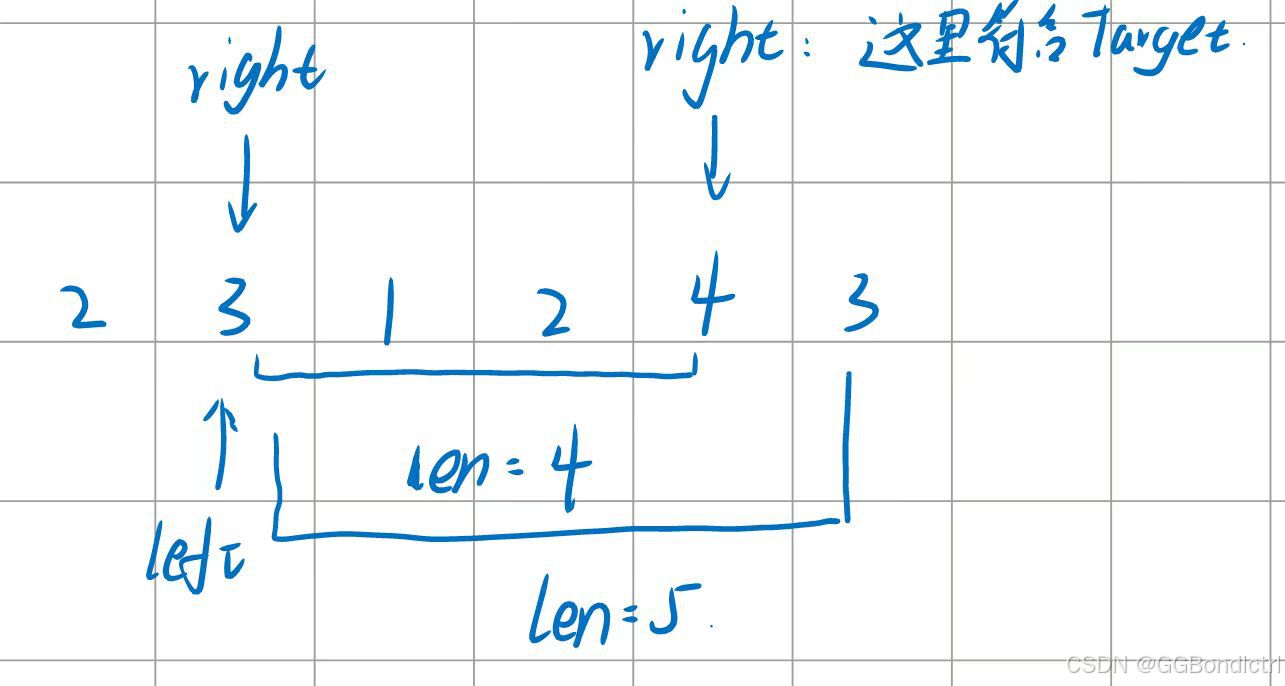 具体的意思,sum就是代表这里的每一步的和,然后当这里的sum大于目标值后就进行判断更新这里的len的大小(取小的)然后此时left移动后,left和right之间的数值就是sum减去left没移动之前的数;