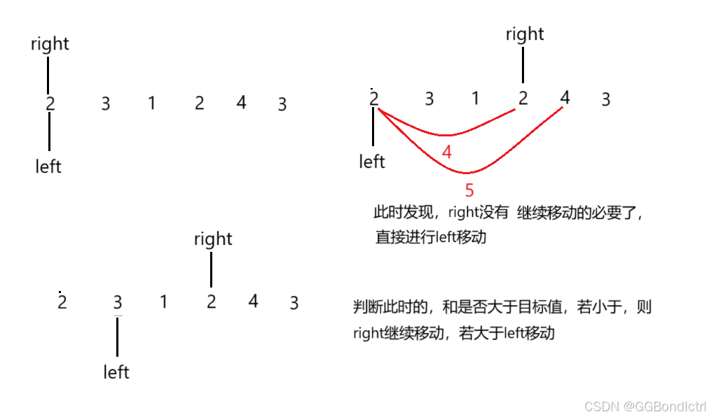 第二步:将这里的right指针向每次后移动一个单位后,进行判断是否大于这里目标值;