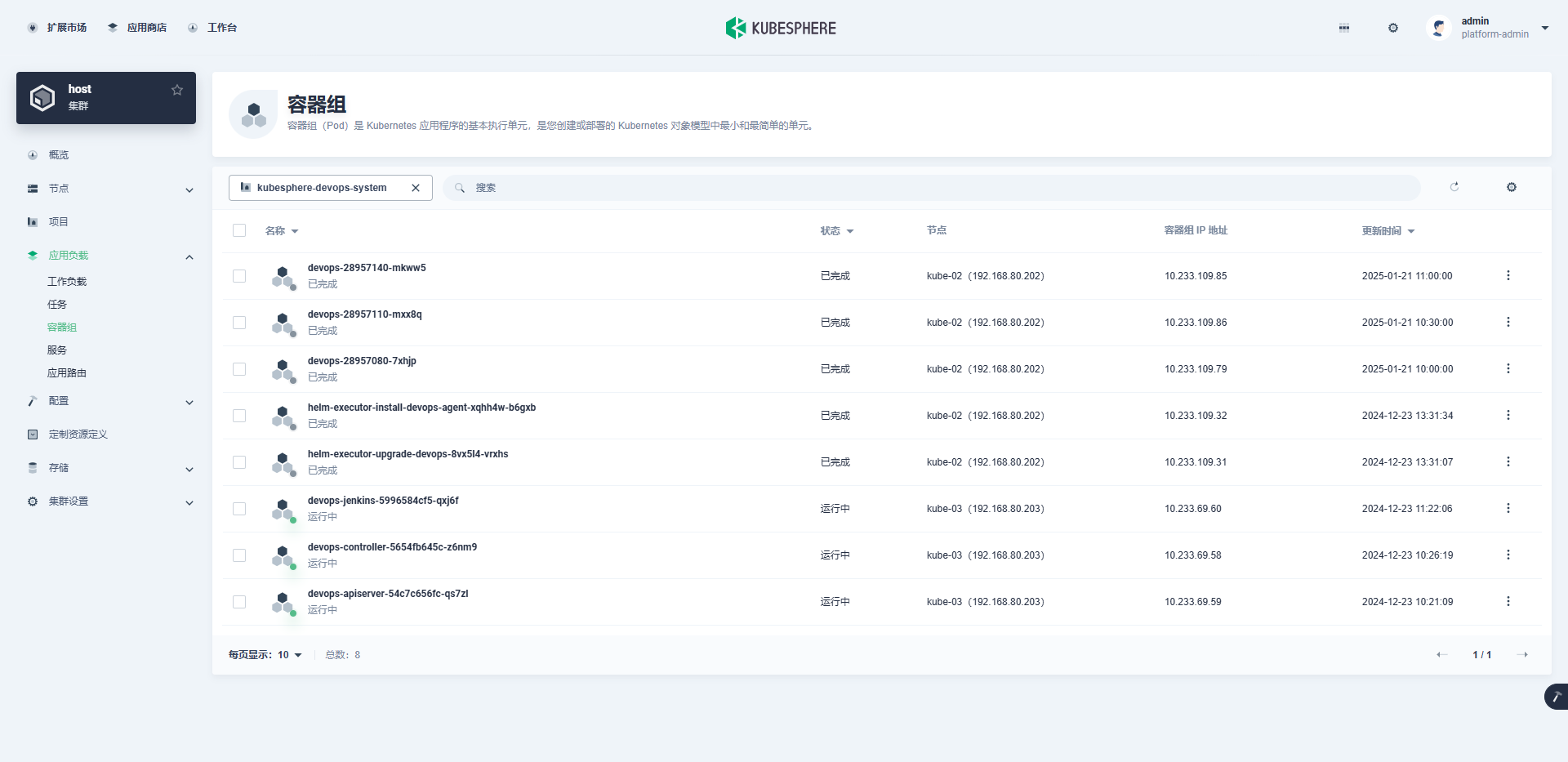 注意:安装DevOps扩展组件的过程中遇到一些问题,多数情况是镜像下载不下来,遇到下载不下来的情况下建议在安装过程中查看kubesphere-devops-system项目下容器组的镜像,发现下载不下来的镜像在本机拉取下来,然后导出到本机上传到k8s节点,再还原上去。