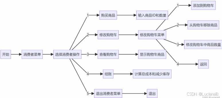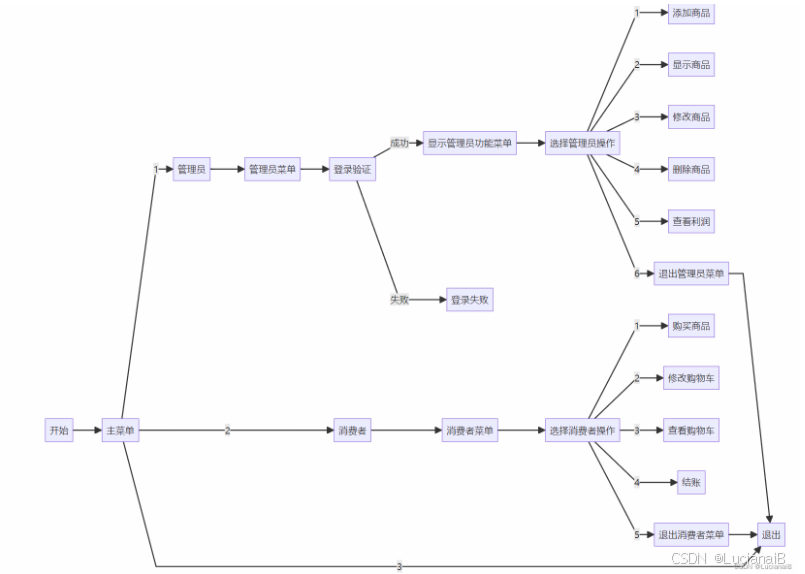 系统运行流程从主菜单开始,用户可以选择进入管理员或消费者功能模块。管理员需要通过用户名和密码登录,而消费者无需登录即可直接购物。系统通过循环和条件语句实现功能选择,并在用户完成操作后返回主菜单或退出程序。