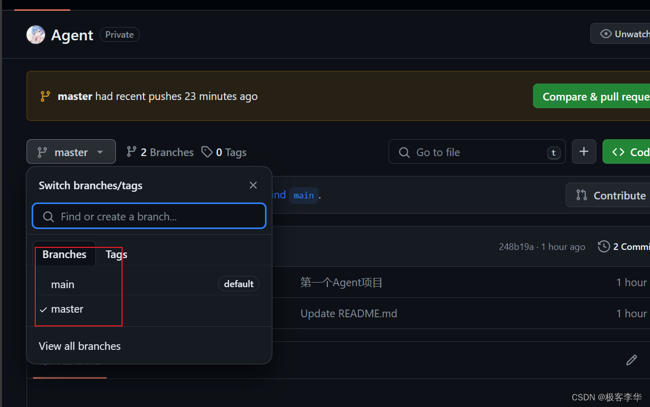 在GitHub里面默认有两个分支,一个是main,一个是master。