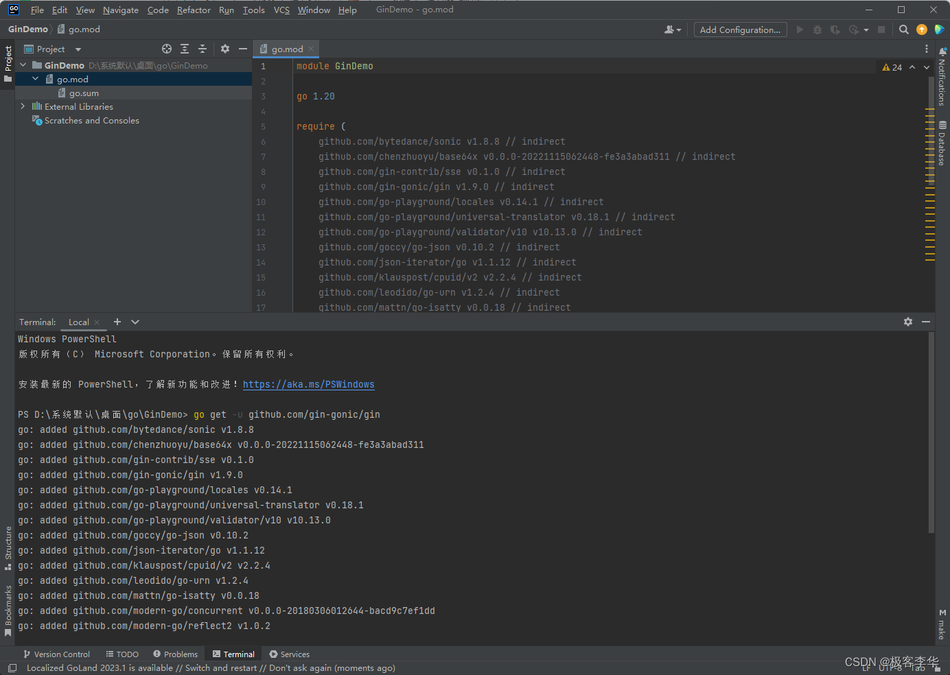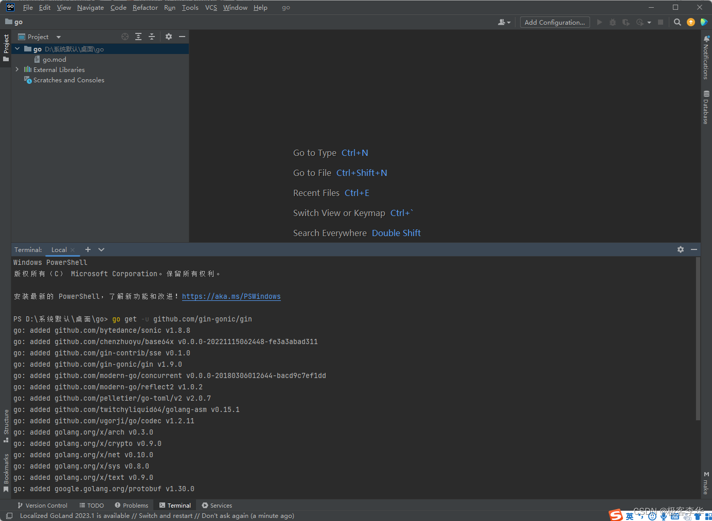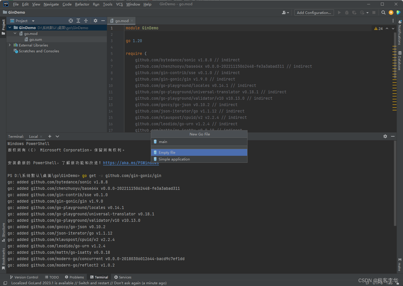 但是需要注意的是,最新版的Gin,必须在有go.mod文件的终端,进行下载。