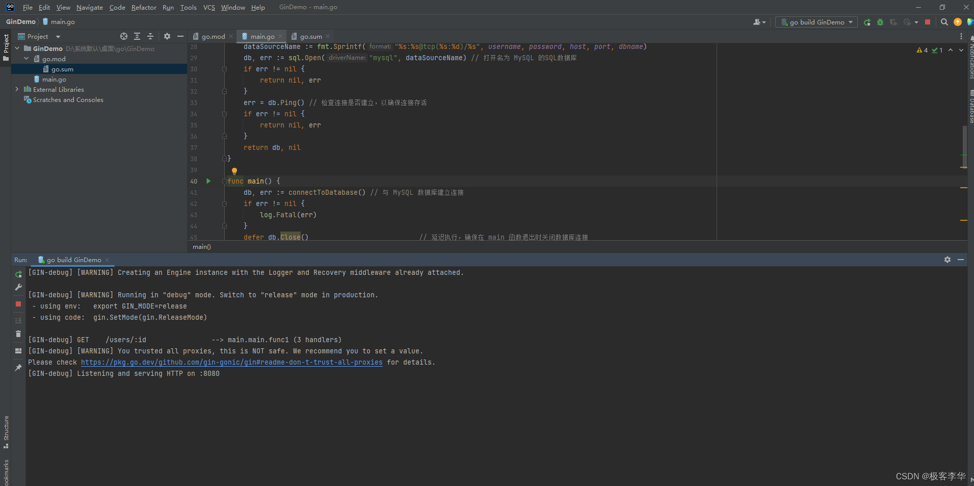 go-sql-driver驱动程序。在命令行终端中键入以下命令:go get github.com/go-sql-driver/mysql输入下载之后可以看见的是,在go.sum里面就有了相关的包