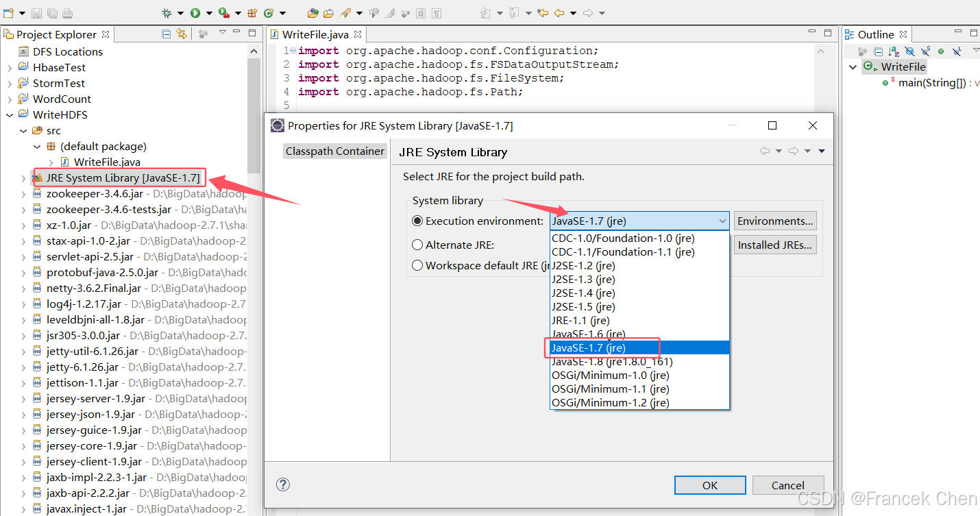 }注意:因为本实验平台大数据集群是使用的jdk1.7版本,必须要使用相同版本才行,如果你是jdk1.8版本,也不用重新配置1.7版本,只需要在Eclipse切换执行环境就行,具体操作如下: