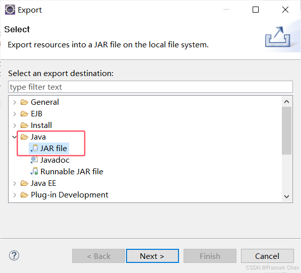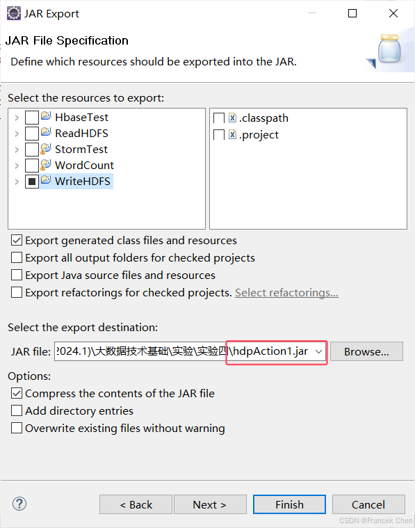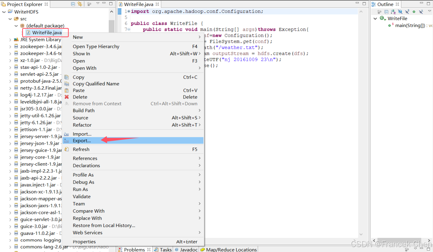 接着,在Eclipse左侧的导航栏选中该项目的WriteFile.java文件,点击Export->Java->JAR File,导出为hdpAction1.jar。