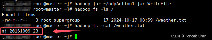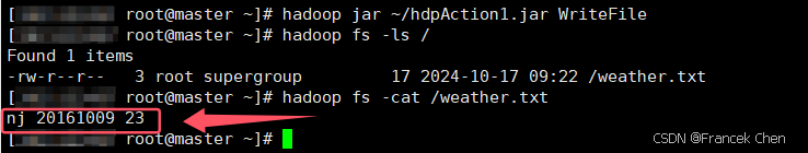 hadoop jar ~/hdpAction1.jar WriteFile查看是否已生成weather.txt文件,若已生成,则查看文件内容是否正确: