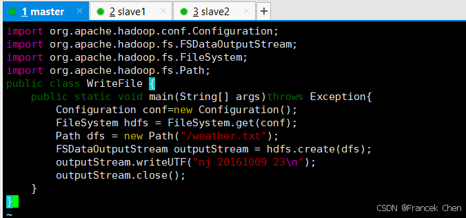 在master服务器上执行命令vim WriteFile.java,编写HDFS写文件程序: