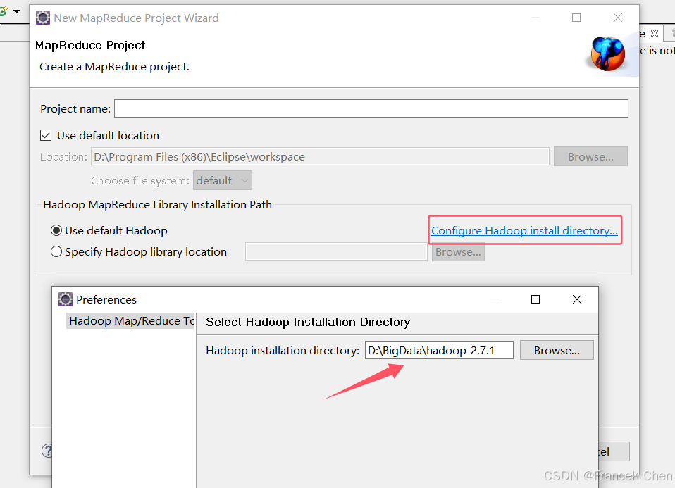 第一次新建Map/Reduce项目时,需要指定hadoop解压后的位置。如图所示。