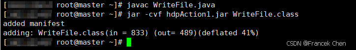 使用javac编译刚刚编写的java代码,并使用jar命令打包为hdpAction1.jar。