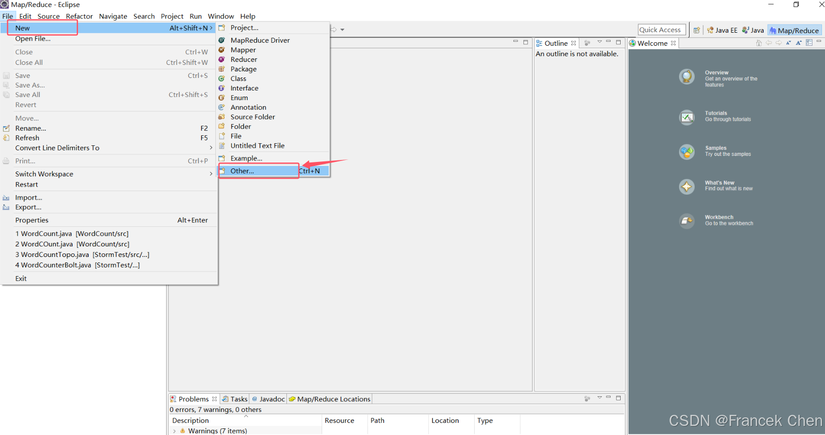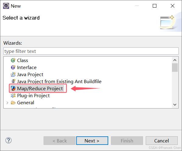 现在,我们需要验证是否可以用Eclipse新建Hadoop(HDFS)项目。打开Eclipse软件,依次点击File->New->Other,查看是否已经有 Map/Reduce Project 的选项。