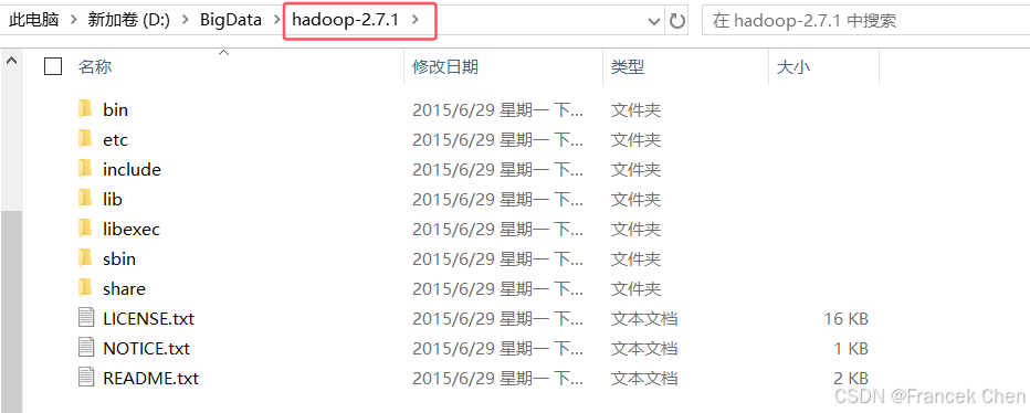 接下来,我们需要准备本地的Hadoop环境,用于加载hadoop目录中的jar包,只需解压hadoop- 2.7.1.tar.gz文件。