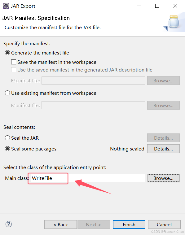 然后点击下一步,再点击下一步,然后配置程序主类,这里必须要选择主类,不然后面上传到服务器就会一直报错。
